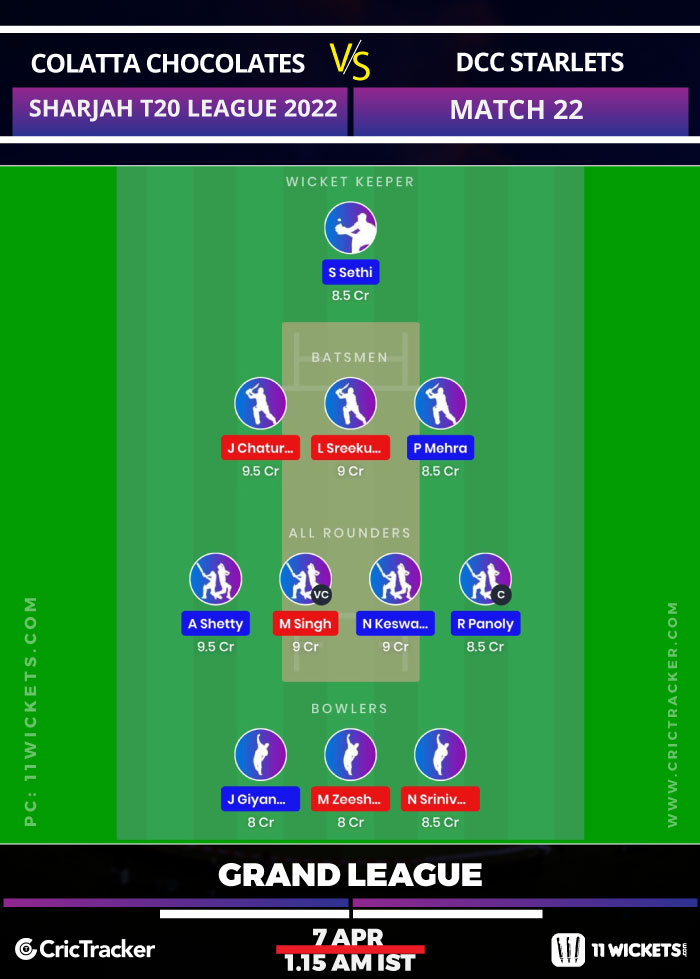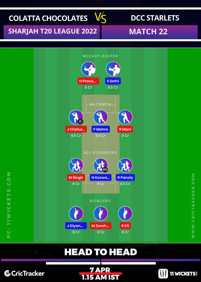 Colatta Chocolates and DCC Starlets will lock horns with each other in Match 22 of the Sharjah T20 League. The Colatta Chocolates have 1 win in 2 league matches and are at the 2nd position in the points table. In their last outing against Dubai Aviators, they chased down a total of 135 in a matter of 11 overs and will look to continue with the same momentum. The team’s key players will be Janaka Chaturanga and Manpreet Singh.