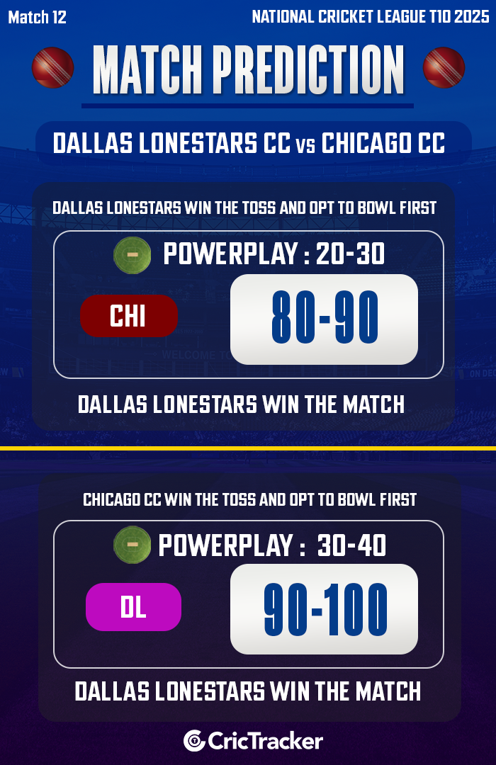 Dallas Lonestars CC (DL) will look to consolidate their position at the top of the points table when they take on a dejected Chicago CC (CHI) side at the University of Texas Dallas on Friday, October 10, in match No. 12 of the National Cricket League T10 (NCL) 2025.