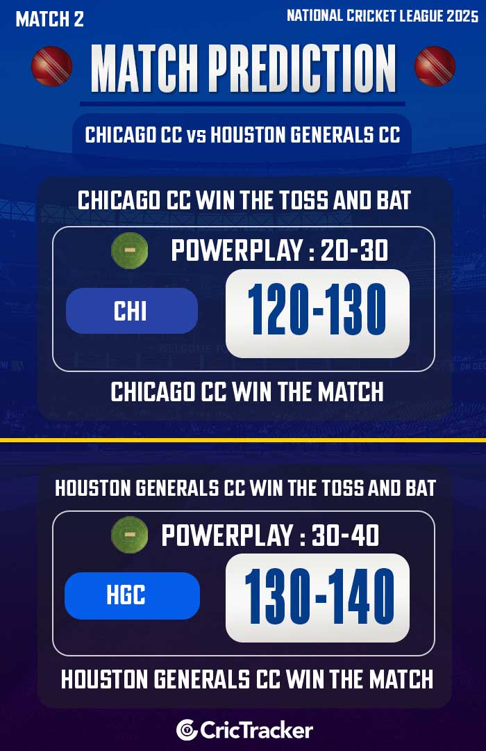 This will be the first time that Chicago CC vs Houston Generals CC go head-to-head in the NCL T10.