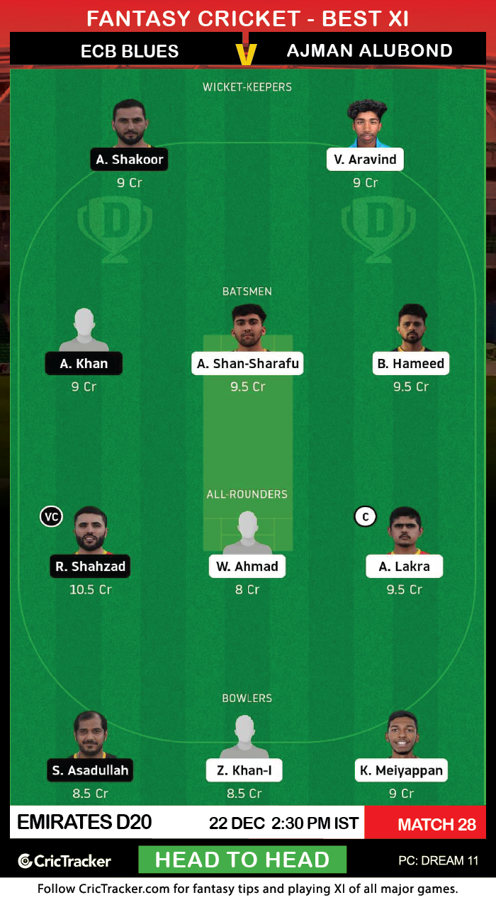 The ECB Blues have played 8 and won 6 games so far, bringing them the 12 crucial points and are at the second spot in the points table. Their opponents, who will find it very hard to defeat them, the Ajman Alubond are pegged at the second last position in the table, having won one out of the 7 games that they have played in. So, it will be interesting to see how the Ajman Alubond play in this game against the higher-ranked team.