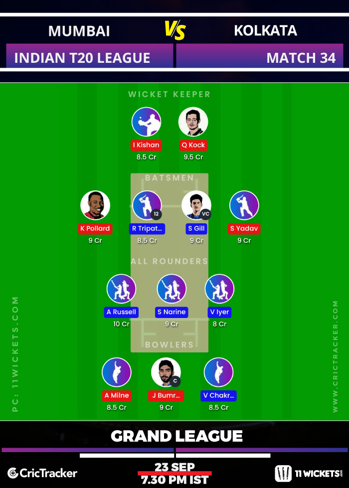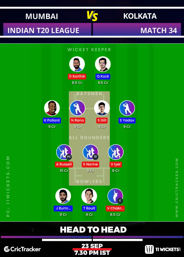 Quinton de Kock, Dinesh Karthik, Shubman Gill, Suryakumar Yadav, Nitish Rana, Venkatesh Iyer, Andre Russell (vc), Kieron Pollard, Jasprit Bumrah, Trent Boult, Varun Chakravarthy (c)