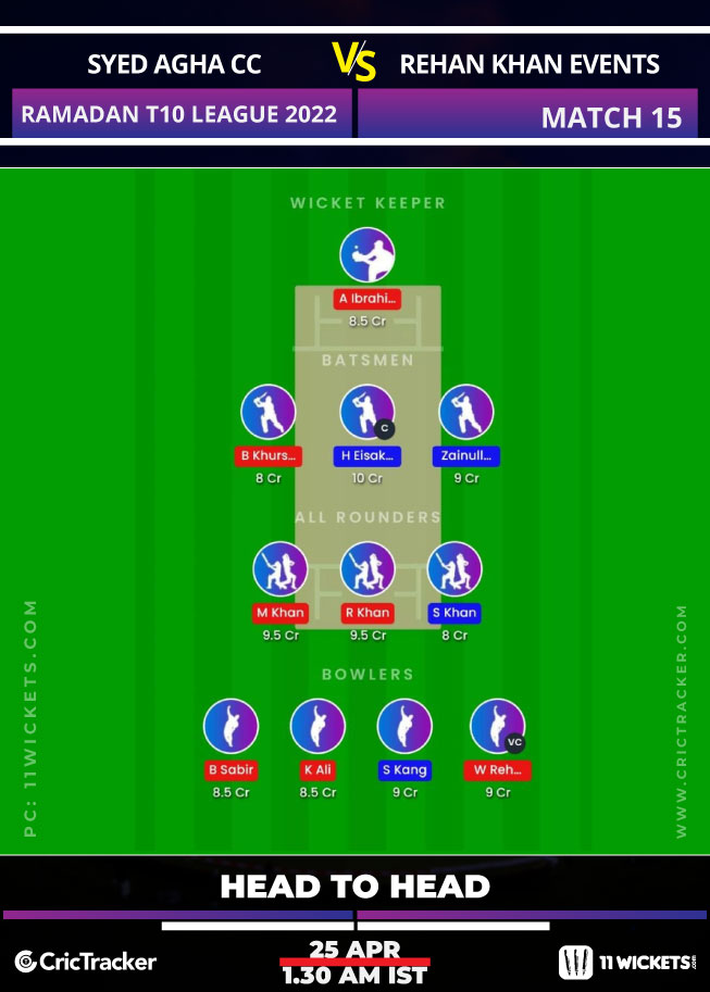 Syed Agha CC will face Rehan Khan Events in the 15th match of the Ramadan T10 League 2022. Syed Agha CC got off to a good start, defeating Fair Deal Defenders by 16 runs in their first game. Khalid Shah and Faisal Altaf each scored 45 and 18 runs, bringing the team total to 104. Rehan Khan Events, on the other hand, did not get the expected result, losing their first game to MEM by 71 runs. They’ll be hoping to win their first game of the tournament.