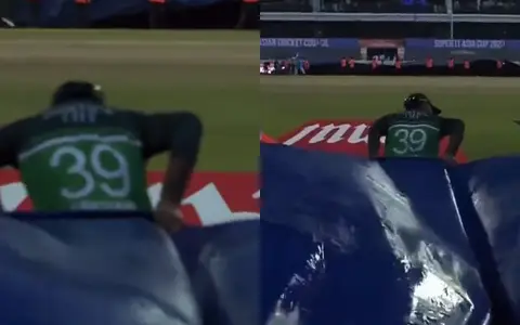 The Super Four stage clash between India (IND) and Pakistan (PAK) began at the R Premadasa International Cricket Stadium in Colombo on September 10. Pakistan won the toss and opted to bowl first. The rain stopped play in the 25th over and India were at 147 with the loss of two wickets. Meanwhile, Pakistan opener Fakhar Zaman was spotted helping the ground staff get the pitch covered following the rain.