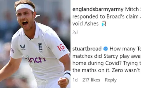 “How many Test matches did Starcy play away from home during Covid? Trying to do the maths on it. Zero wasn’t it?” Broad said in a reply to The Barmy Army's post.